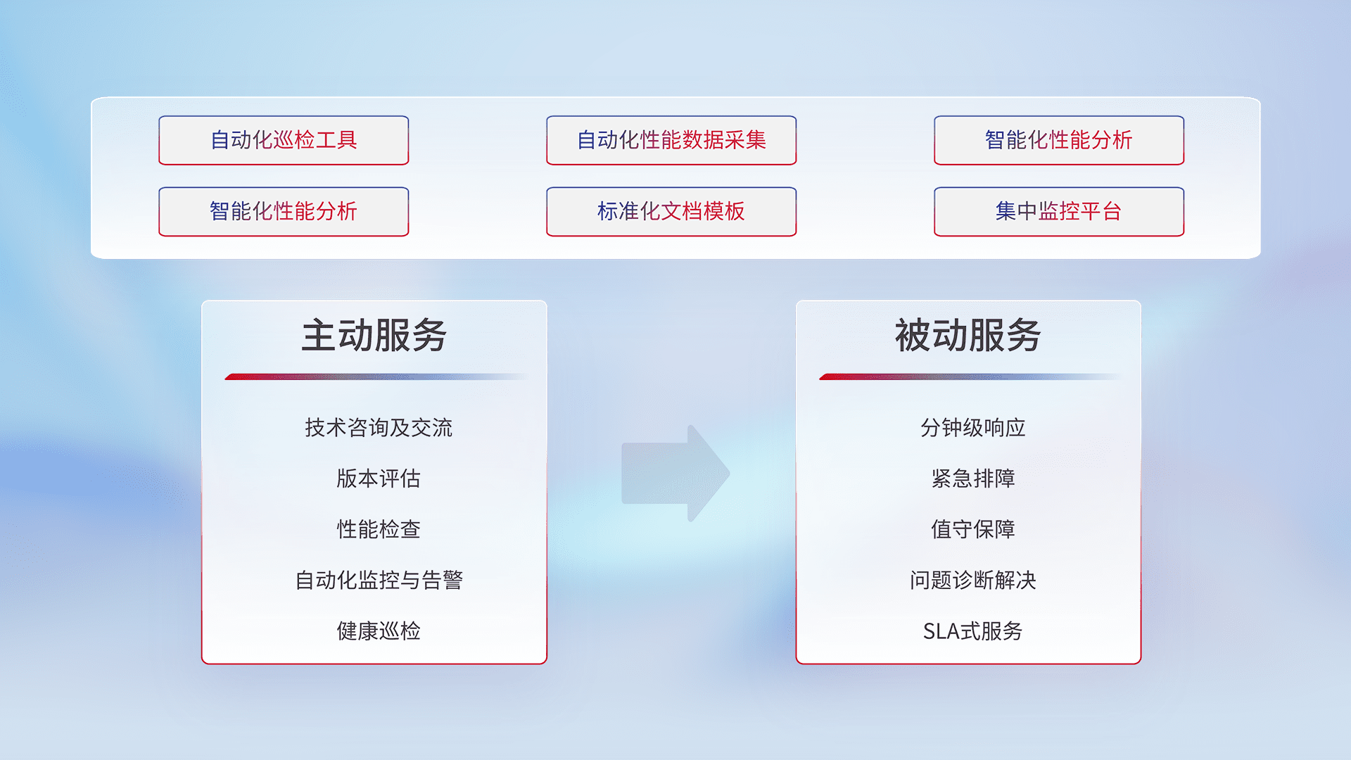 智能化工具和标准化文档,,,保障服务质量,,提供主动服务(包含技术咨询、、、、版本评估、、性能检查、、自动化监控与告警、、健康巡检)和被动服务包含(分钟级响应、、、紧急排障、、值守保障、、问题诊断解决、、、SLA服务)。。